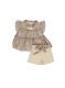 هذا الطقم الأنيق والمميز للفتيات الصغيرات يجمع بين اللمعان والراحة ليمنح طفلتك إطلالة عصرية وجذابة. يتكون الطقم من قطعتين متناسقتين، بلوزة أنيقة بلون ذهبي أو بيج لامع، مصنوعة من قماش ناعم ومريح. تتميز البلوزة بتصميم بدون أكمام مع كشكشة رقيقة على الكتفين تضفي لمسة أنثوية. الياقة دائرية بسيطة، وتزين الجزء الأمامي فيونكة كبيرة بلون أفتح، مما يضيف جاذبية خاصة. تصميم البلوزة واسع ومنسدل، مما يوفر حرية الحركة، شورت أنيق بلون بيج فاتح أو كريمي مصنوع من قماش مريح وعملي. يتميز الشورت بخصر عالٍ ومزين برباط عريض من نفس قماش الشورت، يمكن ربطه على شكل فيونكة أنيقة في المنتصف الأمامي. تصميم الشورت بسيط وعصري، يتناسب تمامًا مع البلوزة اللامعة.