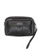 حقيبة يد صغيرة مصنوعة من الجلد الأسود الفاخر، مزودة بسحاب أمامي وجيب يحمل شعار بطباعة بيضاء بارزة. تحتوي على حلقة معدنية مدمجة في تصميمها ويد حمل جانبية، ما يجعلها عملية لحمل الأغراض الشخصية الأساسية بأسلوب أنيق ومريح. مثالية للمشاوير اليومية أو الاستخدام العملي أثناء السفر.
