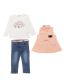 إمنحي طفلتكِ الصغيرة إطلالة ساحرة بهذا الطقم اللافت. مكوّن من ثلاث قطع تيشيرت أنيق بطبعات نصية وورد بأكمام طويلة مع جاكيت بتفاصيل كشكش غاية في الجاذبية وبنطلون جينز مع حزام لارتداء ملائم . مصنوع من خامات راقية وناعمة على بشرتها الرقيقة.