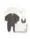 مجموعة متكاملة من أساسيات ملابس المواليد، صُممت لتوفير الدفء والنعومة اللازمين في أيام الشتاء الباردة. تتكون المجموعة من خمس قطع: بربتوز داخلي بأكمام طويلة، وبربتوز خارجي بأرجل مغلقة بسحاب أمامي كامل، صُنع من خامة مضلعة ناعمة. تكمل المجموعة قبعة دافئة للرأس، وزوج من القفازات لحماية يدي الرضيع، بالإضافة إلى مريلة بتصميم دائري. هذه المجموعة ضرورية لحديثي الولادة وتوفر تنسيقاً عملياً ودافئاً، وهي متوفرة الآن في متجر الهرم الإلكتروني.