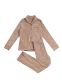 استمتعي بأقصى درجات الدفء والراحة مع هذه البيجامة النسائية الشتوية المصنوعة من قماش مخملي فائق النعومة والملمس الفاخر، مما يجعلها مثالية للأيام الباردة. يتألف الطقم من قطعتين: بلوزة ذات أكمام طويلة بياقة مطوية كلاسيكية وتغلق بالكامل بأزرار أمامية أنيقة. يزين الياقة وحافة جيب الصدر الأمامي الأيسر شريط من الدانتيل الرقيق، مضيفًا لمسة أنثوية ساحرة. أما البنطلون الطويل، فيتميز بخصر مطاطي مريح للغاية لضمان ملاءمة مثالية دون أي إزعاج، كما تزدان أطرافه السفلية بنفس تفاصيل الدانتيل الأنيقة التي تكمل المظهر المتناسق للطقم. هذه البيجامة تجمع